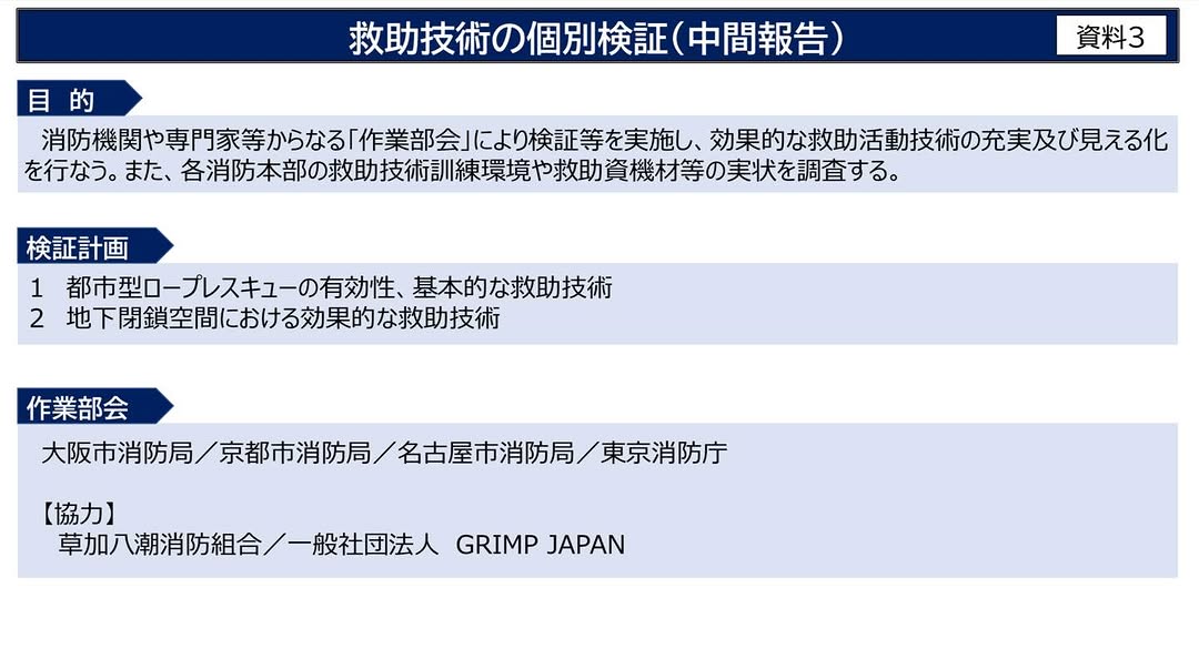 GRIMP JAPANは総務省消防庁の令和7年度救助技術の高度化等検討会におけるロープレスキュー技術の個別検証に協力させていただいています。