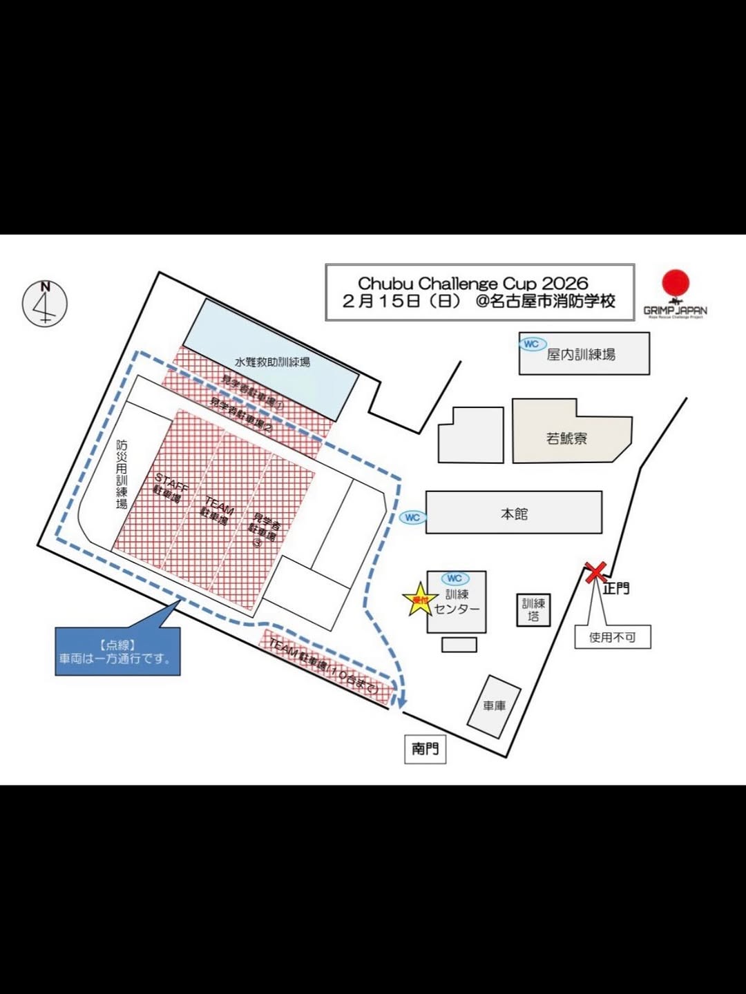 ・消防学校南門から入り、敷地内に駐車してください。